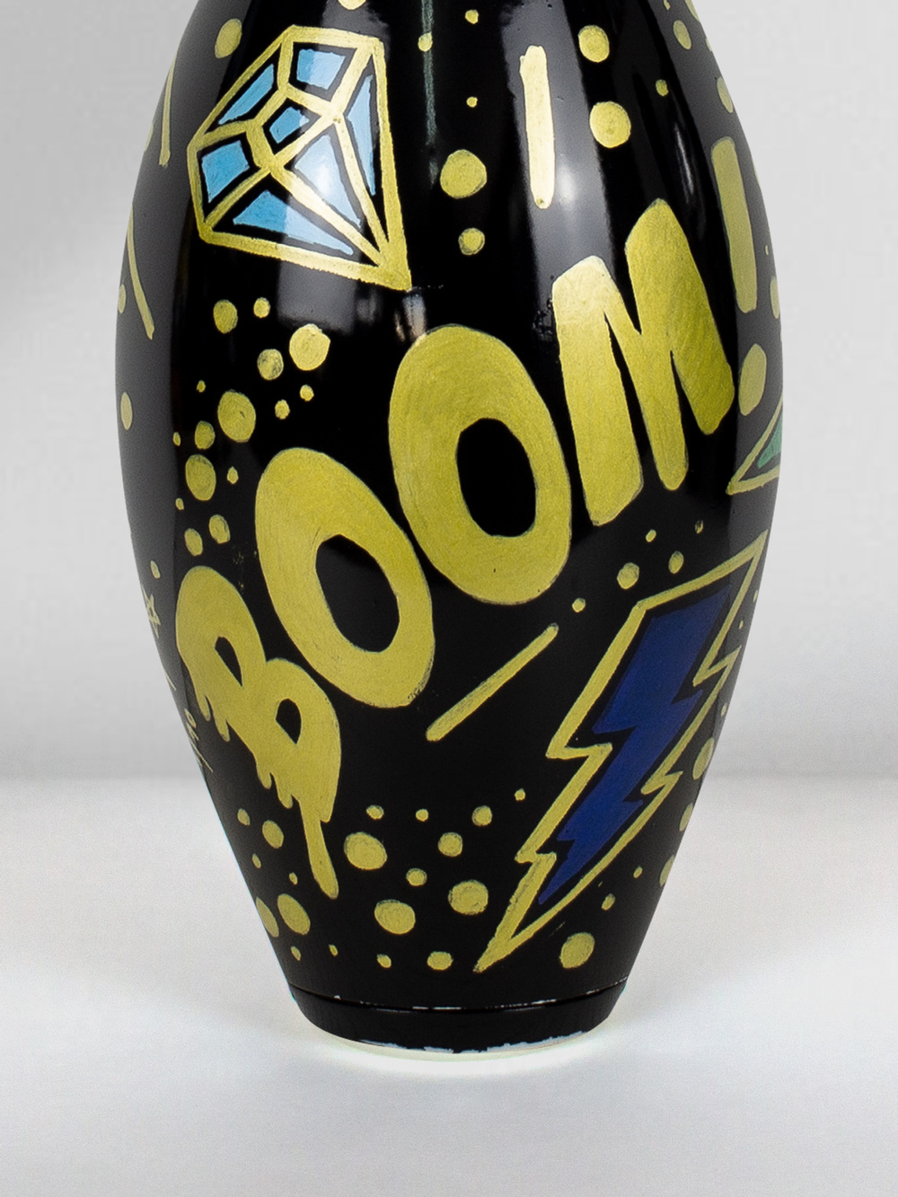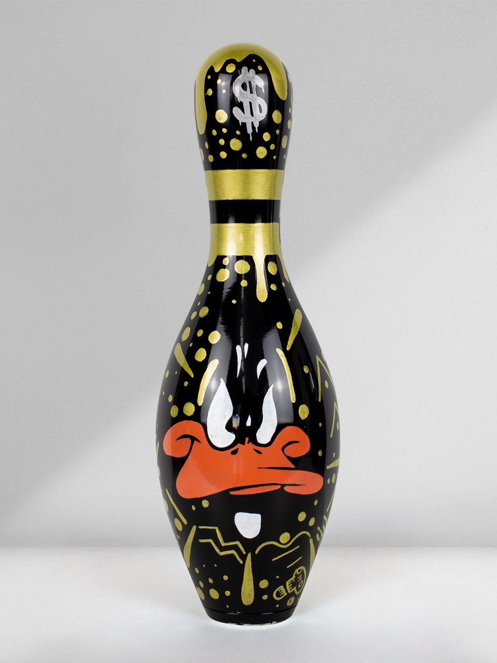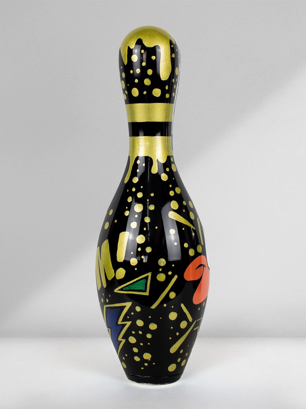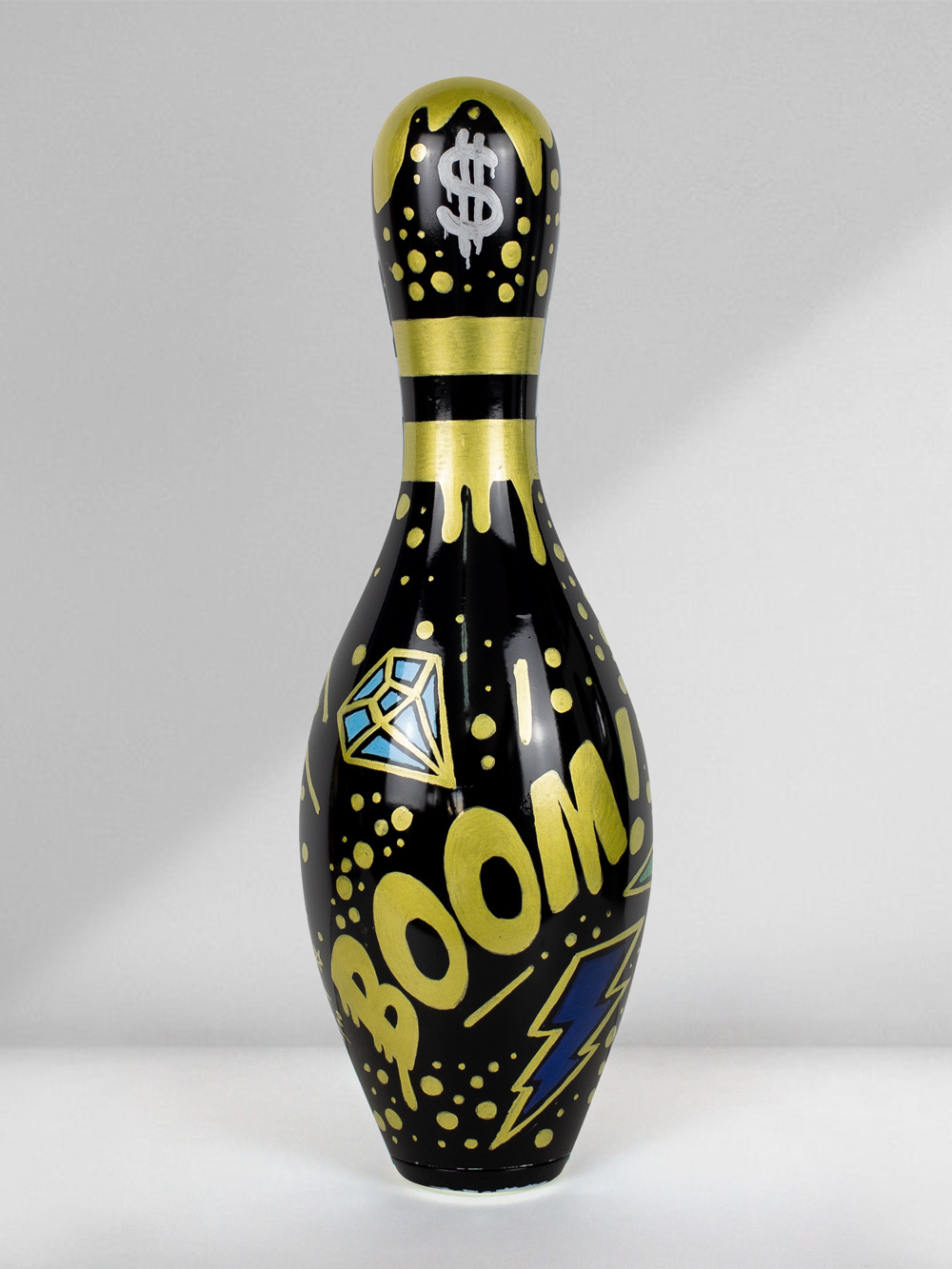 This work belongs to a collection called “Luxury Bowling Series”. Mixed media pins.
