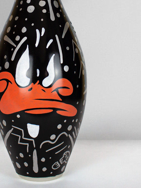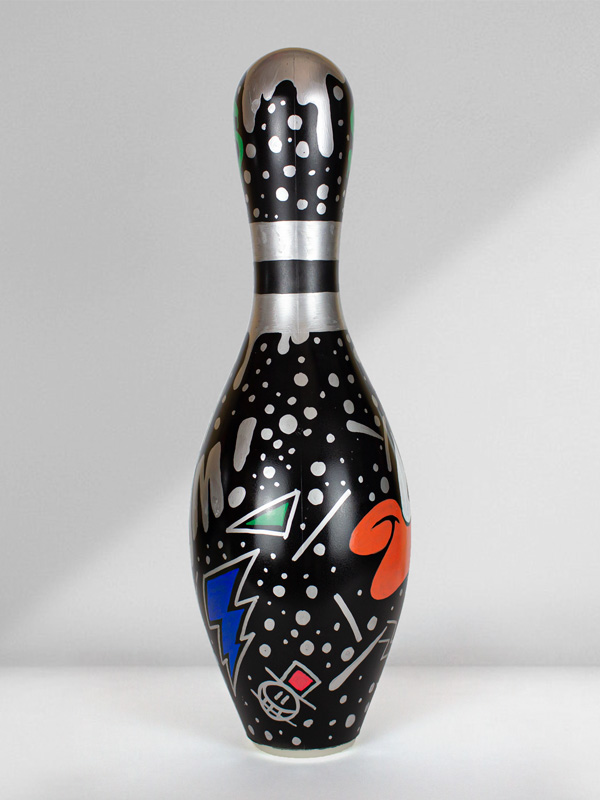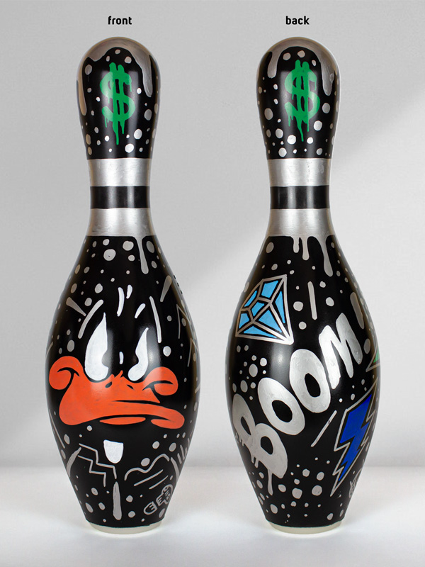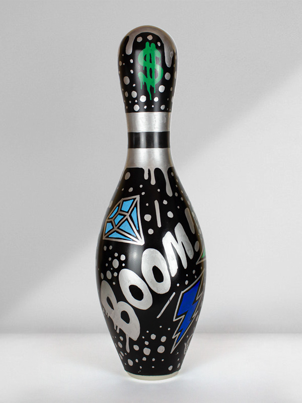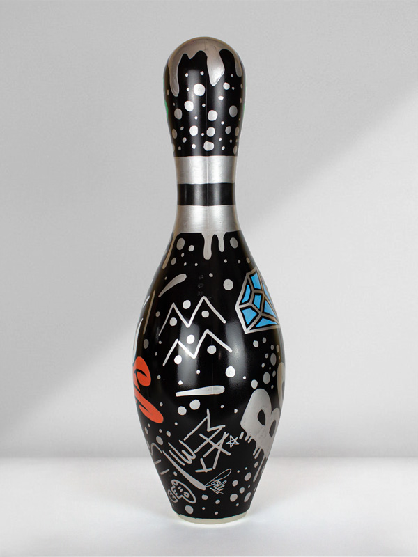 This work belongs to a collection called “Luxury Bowling Series”. Mixed media pins.