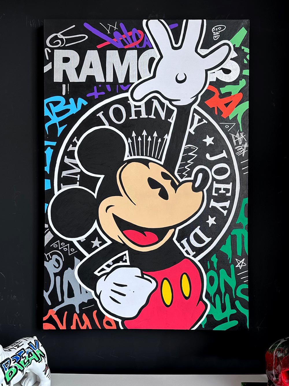 Mickey Mouse pop art acrylic painting with Ramones logo canvas on 3D cotton canvas.