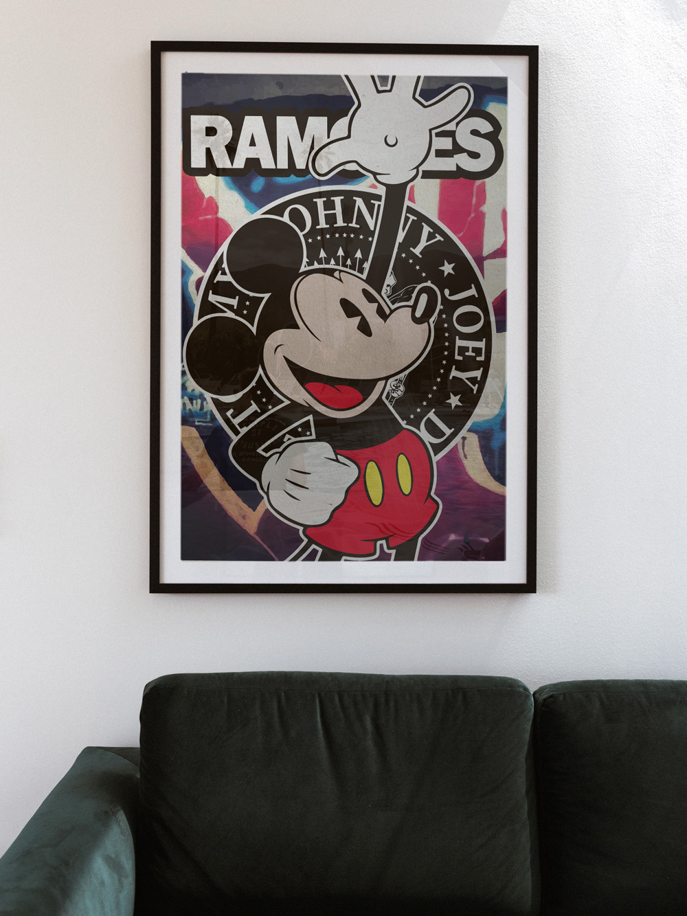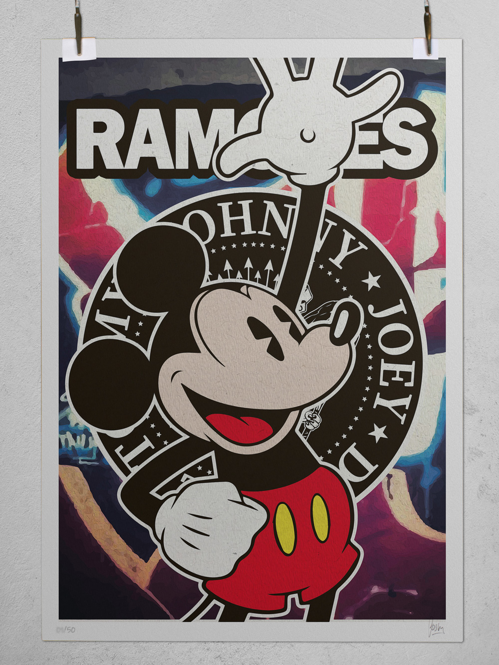 Contemporary Pop Art mixing Mickey Mouse with The Ramones logo, graffiti textures and street-art energy, reinterpreted by Josh Mahaby.