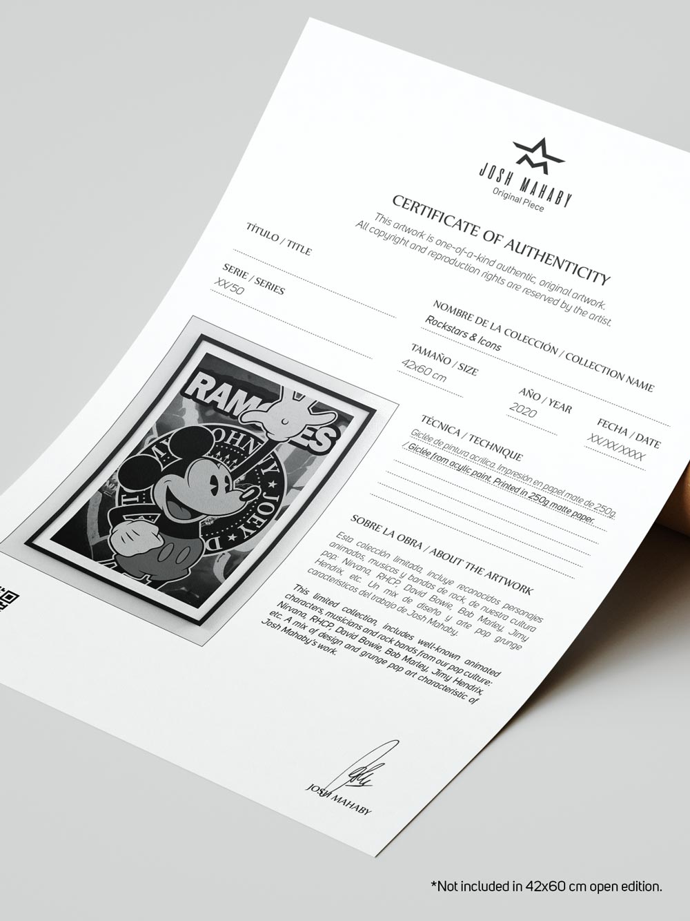 - Edition: Open edition, hand-signed with artist’s stamp on back (not numbered, no certificate) in A2 (42×60 cm) / Limited, hand-signed and numbered — 50 copies in A2 (42×60 cm) and 50 copies in 70×100 cm