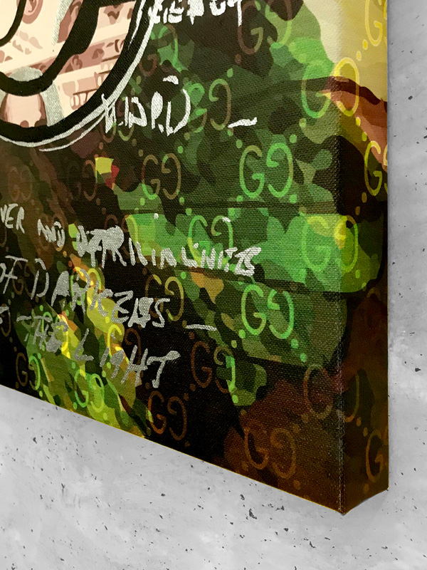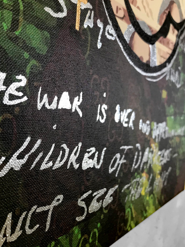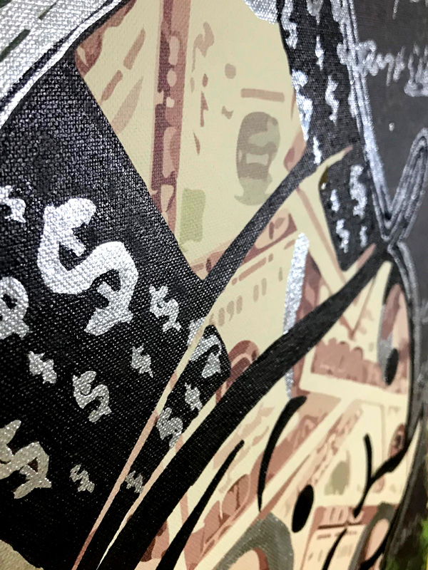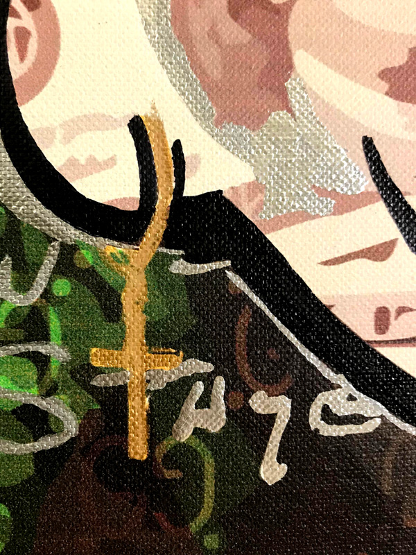 Technique: Mixed media on framed wood canvas. Acrylic, metallic paints, and digital print.