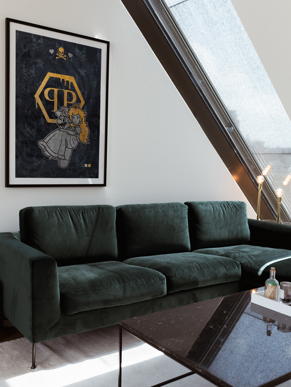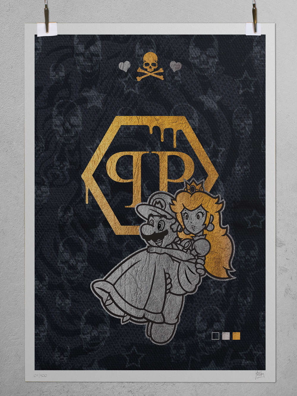 Luxury poster print on digital illustration with Philipp Plein logo and Mario Bros pop art Style by Josh Mahaby