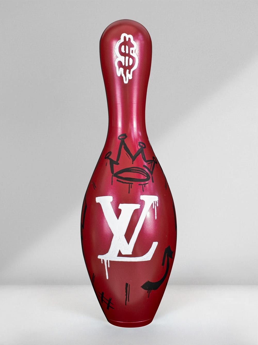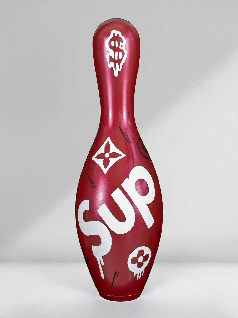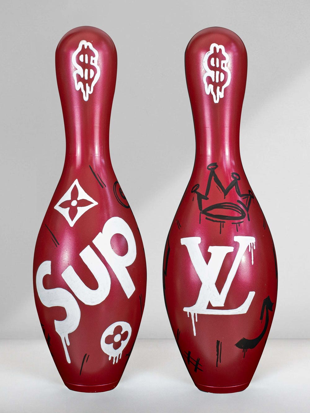 Supreme and Louis Vuitton logo painted pop art style on red bowling pin.