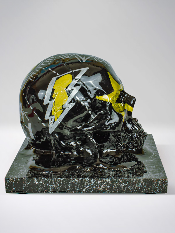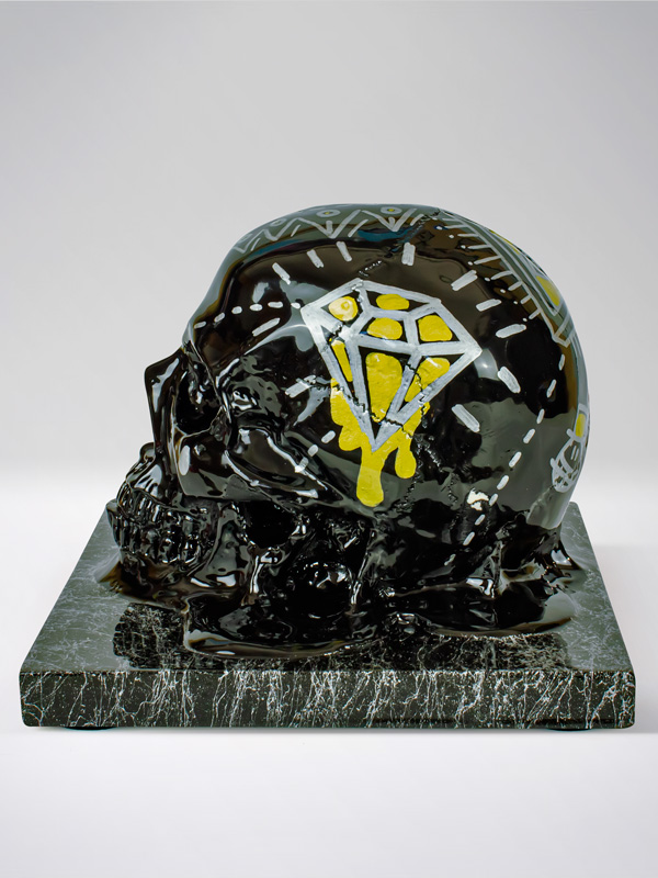 - Technique: Mixed media acrylic and metallic paint over resin skull